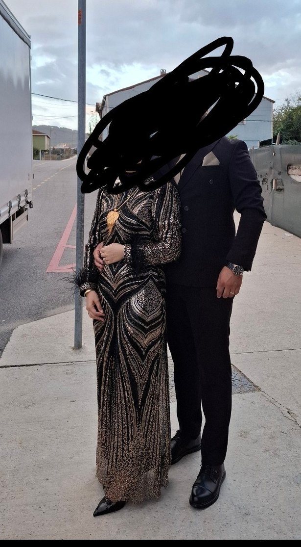 Fitted kesim, uzun kollu, drapeli ve desenli koyu altın renkli kadın abiye elbise, klasik şıklık için uygundur. ✨