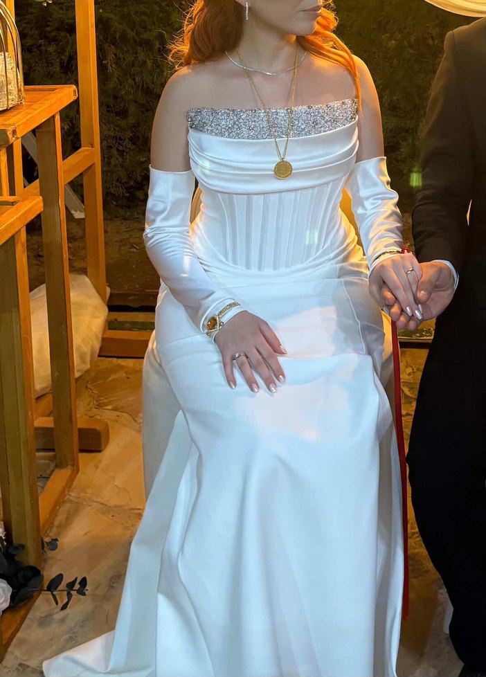 Uzun kollu, straplez yakalı ve drapeli detaylara sahip beyaz nişan elbisesi. Parlak işlemeli deseniyle modern klasik tarz sunar.