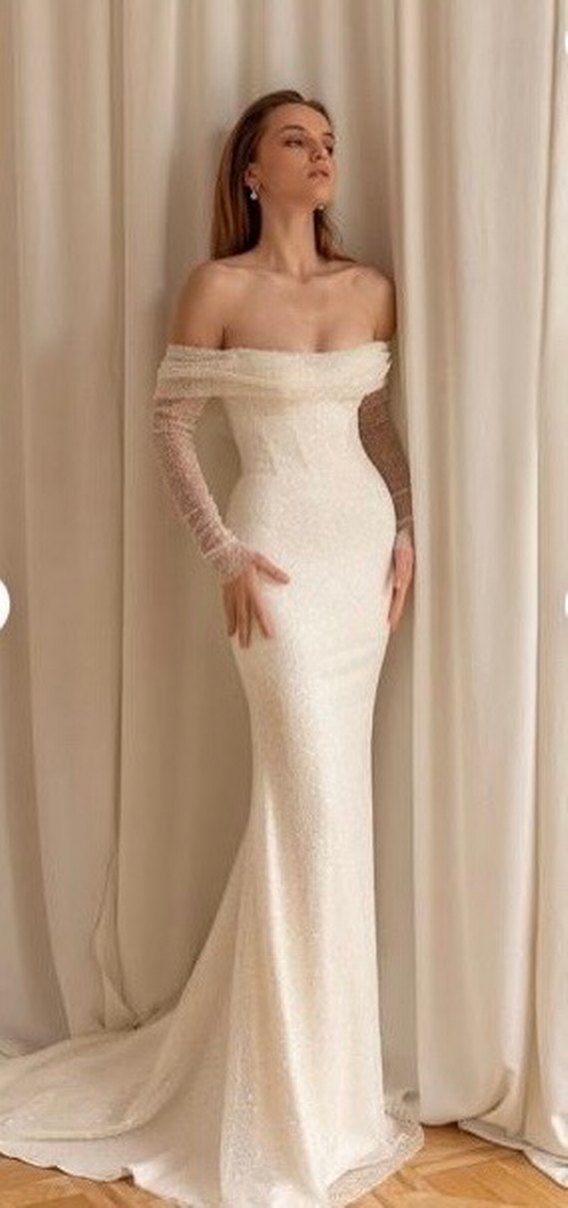 Bu beyaz abiye, drapeli straplez yaka ve uzun kollu tasarımıyla modern klasik tarzda, vücuda oturan şık bir siluet sunar.