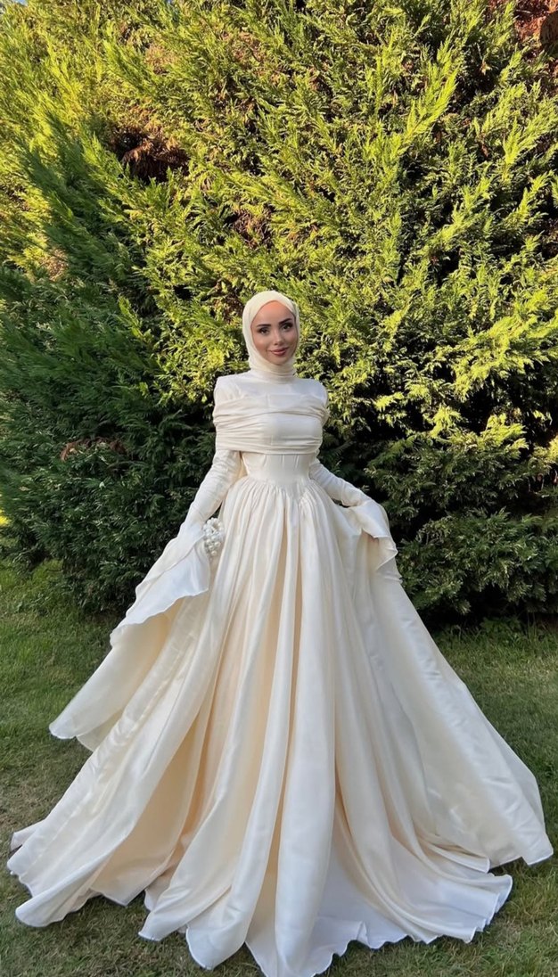 KİŞİYE ÖZEL DİKİM FİYATIDIR ABİYEDEN GELİNLİĞE İSTEDİĞİNİZ MODELİN ÖZEL DİKİMİ YAPILIR uzun kollu ve drapeli tasarımıyla modest ve gösterişli bohem tarz sunar. Uzun boyu ve straplez görünümü zarif siluet oluşturur.
