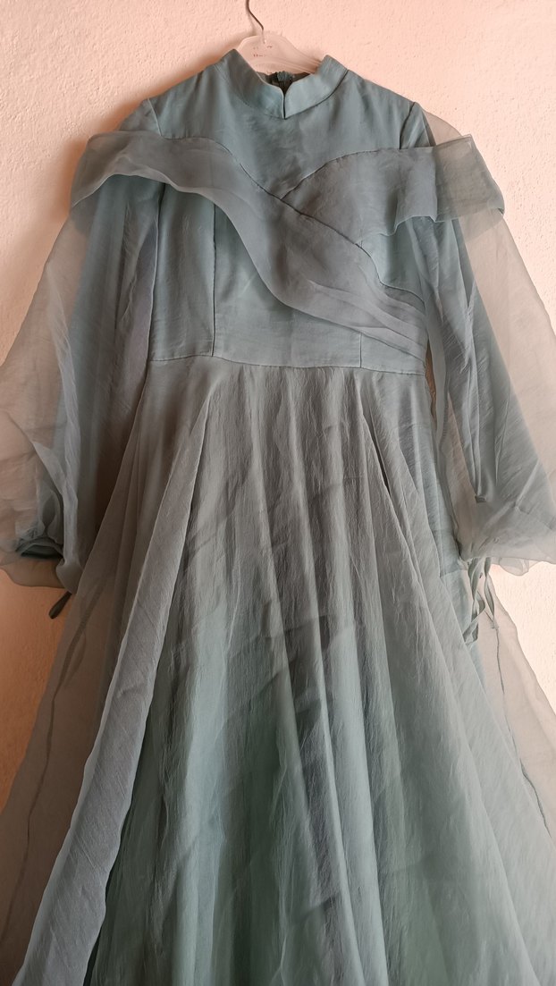Uzun kollu, bol kesim ve tek renkli bu elbise, tekne yakalı ve drapeli tasarımıyla vintage bohem tarzını yansıtıyor.