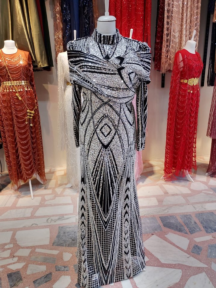Uzun boy, yüksek yakalı ve uzun kollu bu abiye elbise, drapeli tasarımı ve desenli çok renkli gri kumaşıyla dikkat çeker. Düğün için uygundur ve modern, avangart bir görünüm sunar.