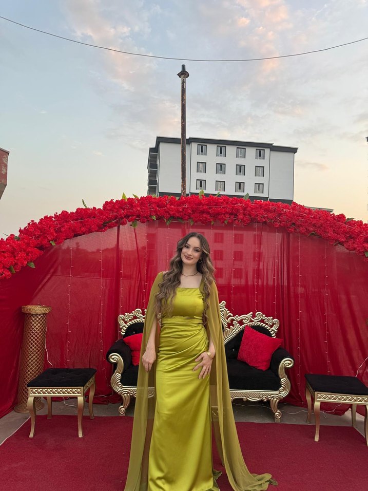 Drapeli, straplez yaka ve uzun kollu bu gold abiye, etnik desenlerle süslenmiştir. Cesur ve gösterişli pop kültür tarzında, düğünler için uygundur. ✨ ürün dikilmiştir bir kere giyildi