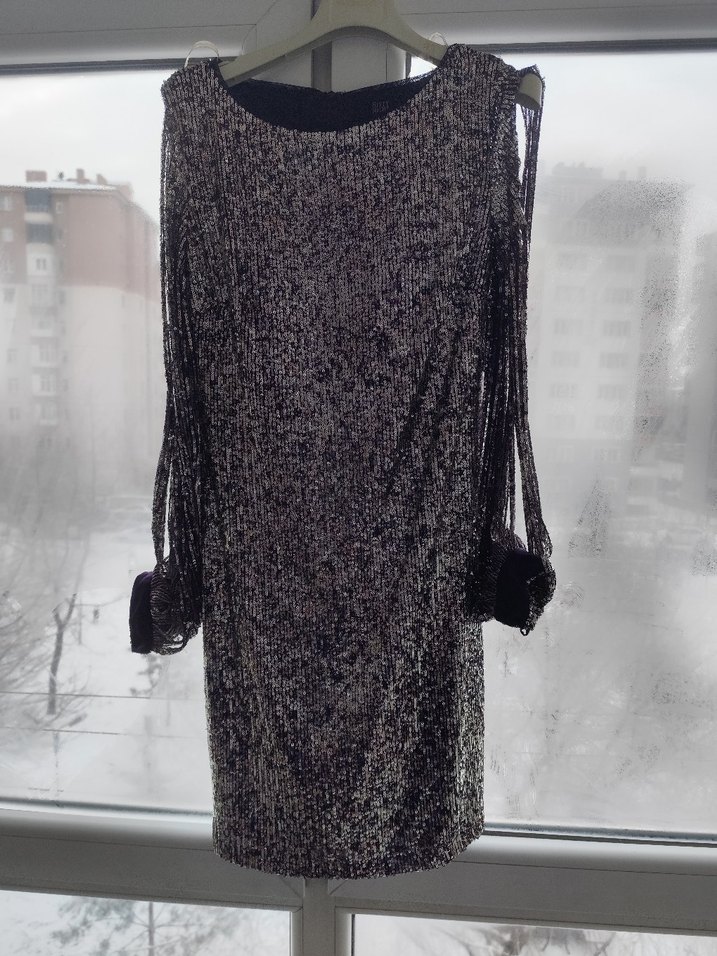 Gri renkte, drapeli tasarıma sahip uzun kollu, vücuda oturan abiye elbise. Straplez yaka ve desenli kumaşıyla partiler için ideal.