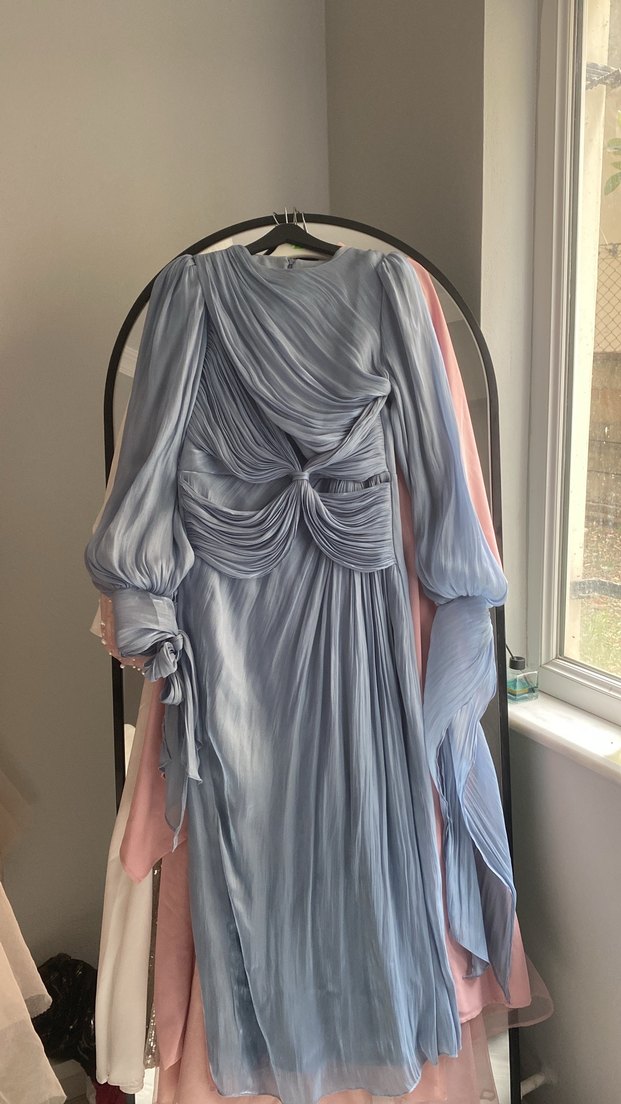 Uzun Kollu Drapeli Gri Kadın Abiye Elbise