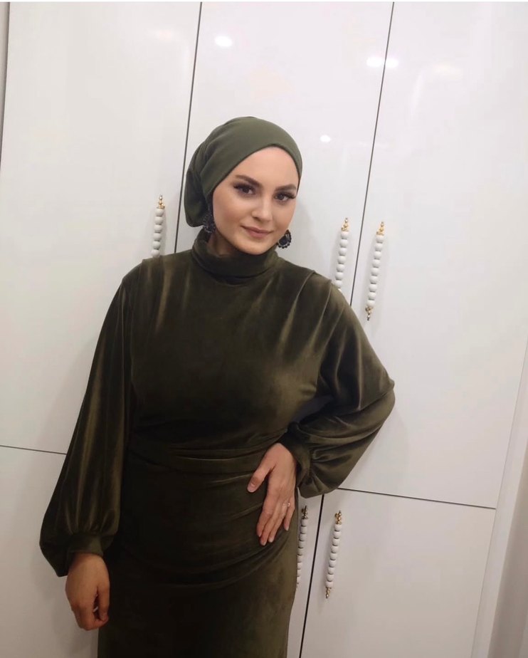 Drapeli tasarımı ve etnik desenleriyle, yüksek yakalı, uzun kollu, haki renk ve dar kesim kadın elbisesi. Çok şık bir kadife elbise özel bir tasarım bu butik bir mağazadan almıştım dar gelmeseydi asla satmazdım 2000 TL’ye almıştım hiçbir kusuru yoktur
