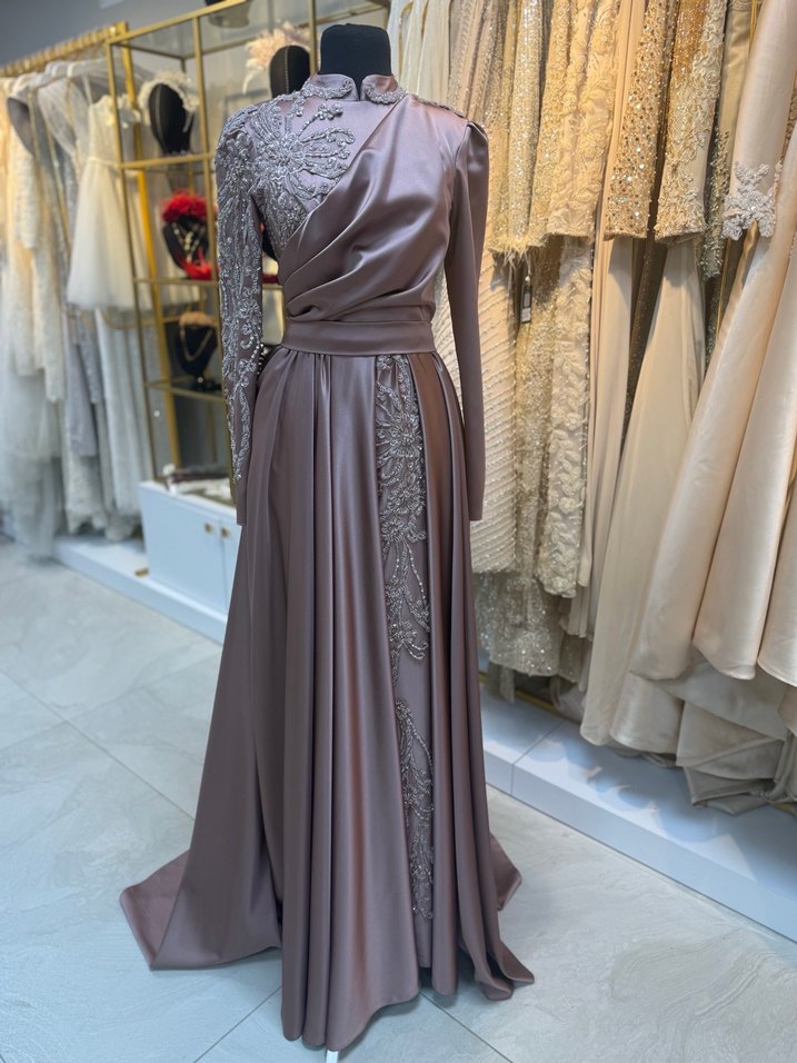 Uzun Kollu Drapeli İşlemeli Abiye Elbise