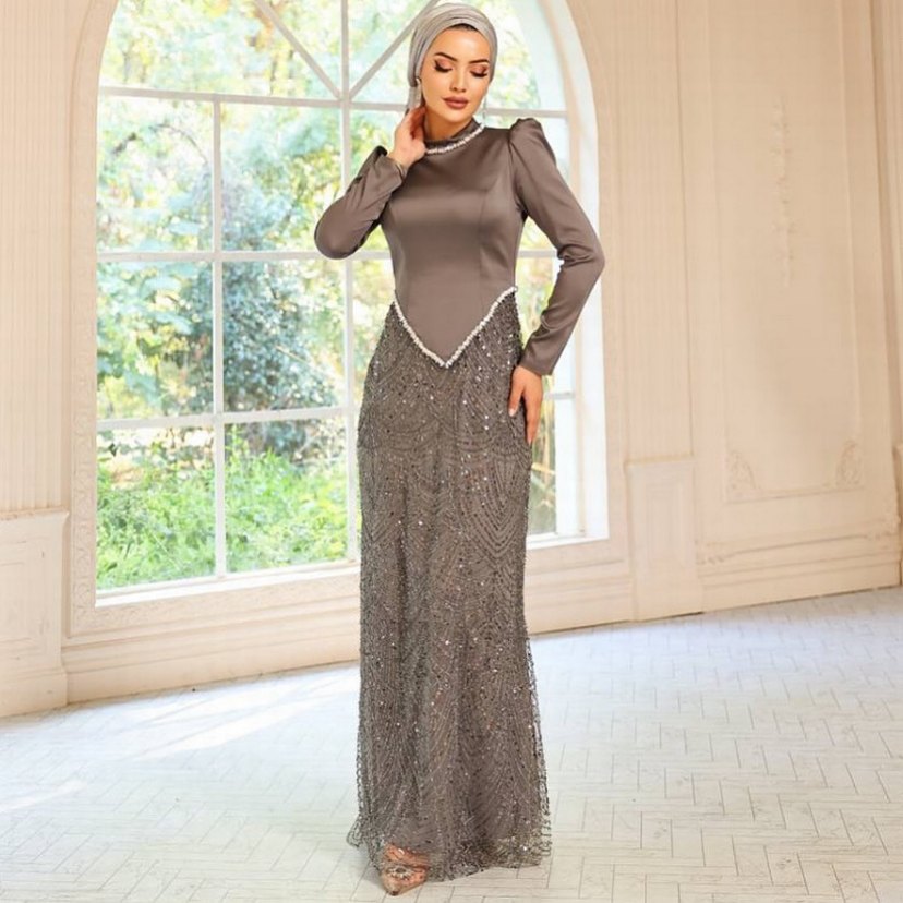 Uzun kollu, V yaka drapeli üst kısmı ve işlemeli etek kısmıyla modern klasik tarzda, kahverengi ve gri tonlarda abiye elbise. Düğün için uygun.