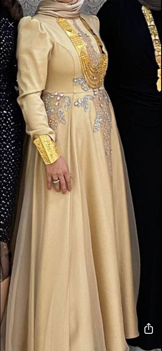 Bu uzun kollu, straplez yakalı nişan elbisesi, drapeli detaylara sahiptir. Parlak altın rengi işlemelerle süslenmiş, gösterişli bir tasarımdır.