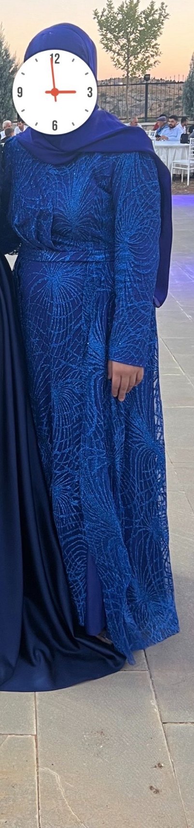 Uzun kollu, drapeli detaylara sahip, koyu mavi desenli ve tekne yakalı bu abiye elbise, modest ve çağdaş tarzıyla düğünler için uygundur.