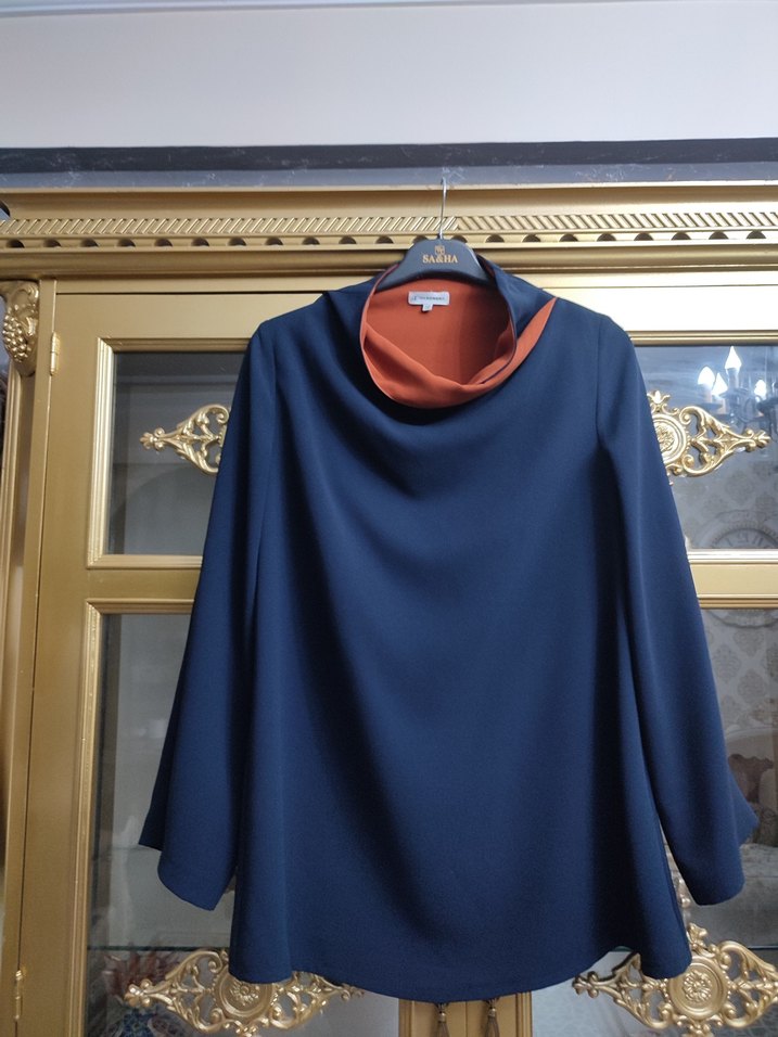 Uzun kollu, drapeli yüksek yakalı kadın bluz. Koyu mavi renkte, modern klasik tarzda, ofis için uygun, klasik şıklığı yansıtan sentetik kumaştan üretilmiştir. ✨