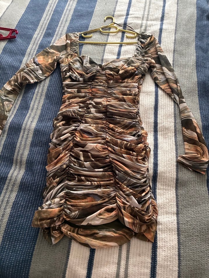 Vücuda oturan, uzun kollu ve drapeli kadın mini elbise. Kahverengi ve gri tonlarında tie-dye desenli, yumuşak sentetik kumaştan, sokak modasına uygun. Bedeni kumaşı esnek 36-40 beden arasına uygundur