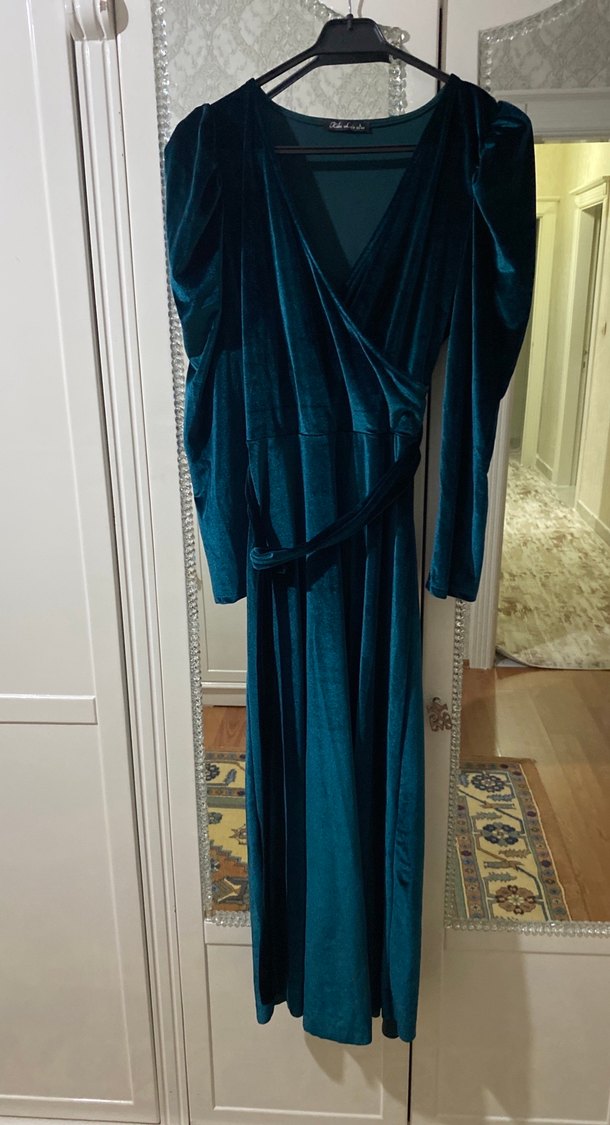 Uzun Kollu Drapeli Klasik zümrüt yeşili Elbise