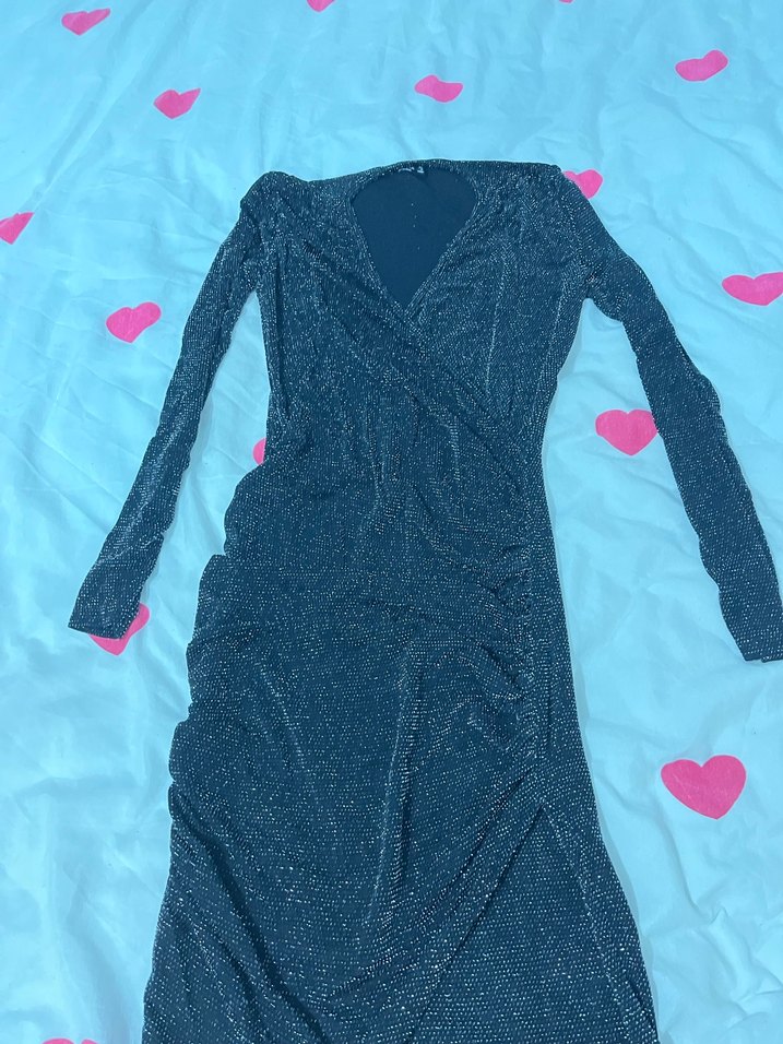 Uzun kollu, V yakalı, drapeli ve vücuda oturan koyu mavi abiye elbise. Gotik tarzda, göz alıcı ve şık bir parti elbisesi. ✨