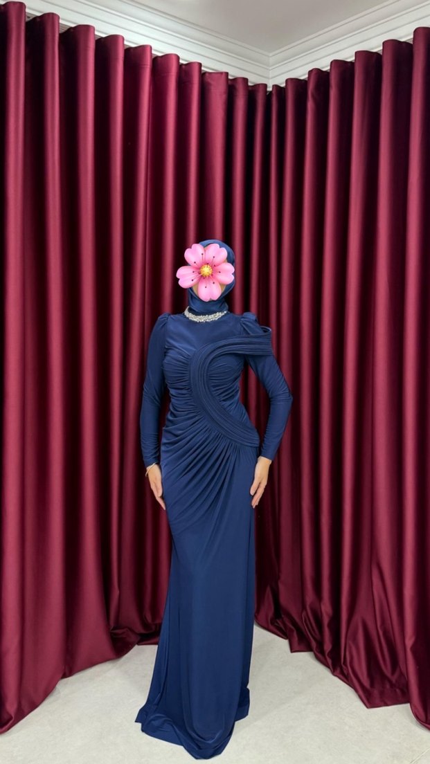 Bu dar kesim uzun abiye elbise, yüksek yakalı ve uzun kollu, drapeli lacivert tasarıma sahiptir. İnce çiçek desenleriyle düğün ve avangart stiller için uygundur. #kiralık
