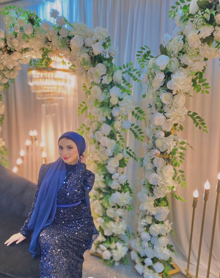 Bu dar kesim uzun abiye elbise, yüksek yakalı ve uzun kolludur. Koyu lacivert bağlama desenli, drapeli detaylara sahiptir. Düğünler için uygun, mütevazı ve gösterişli bir tarza sahiptir. Şal dahil