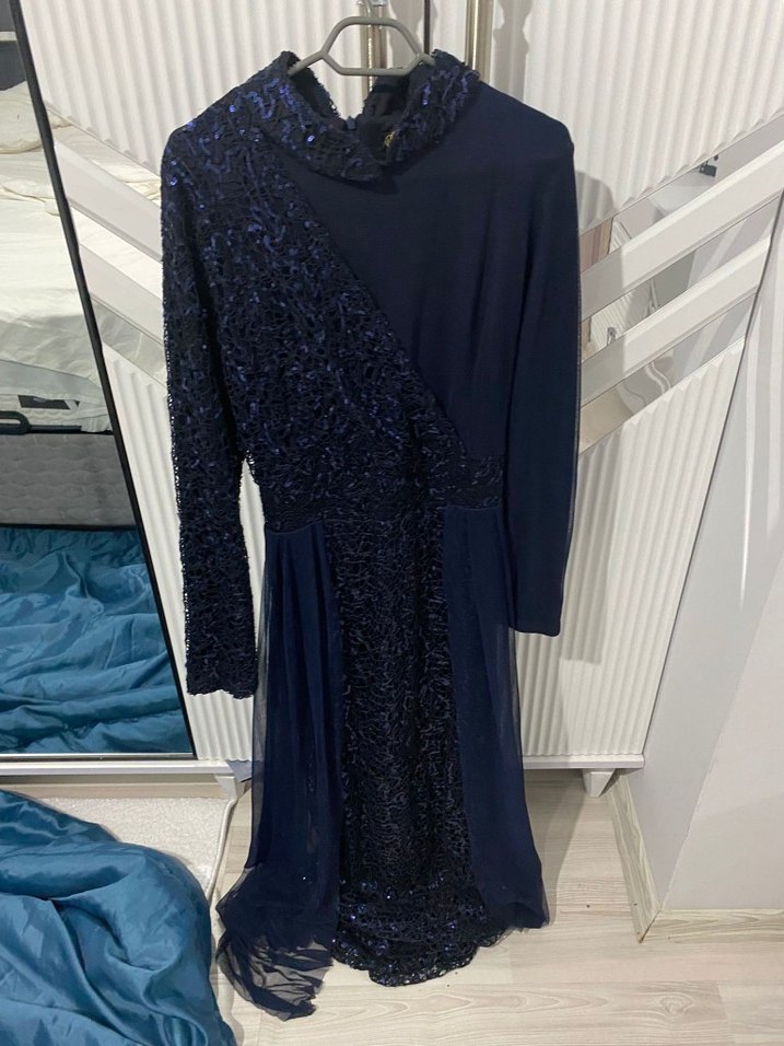 Yüksek yakalı, uzun kollu ve drapeli tasarıma sahip uzun, dar kesim lacivert abiye elbise. Avant-garde tarzda şık bir seçim.