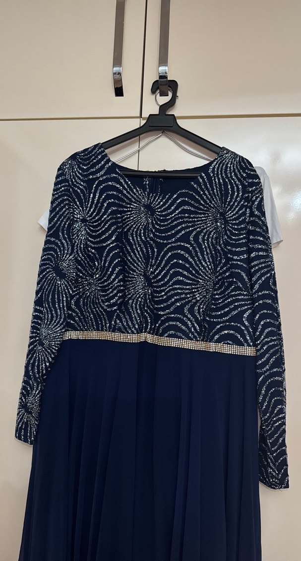 Uzun kollu, V yakalı lacivert abiye elbise, drapeli ve dökümlü kesime sahiptir. Parlak desenli ve rahat kalıplıdır, düğünler için uygundur. ✨