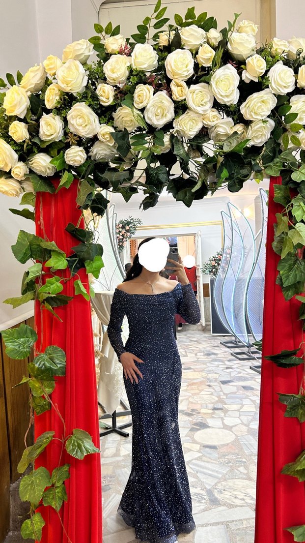 Uzun Kollu Drapeli Lacivert Abiye Elbise