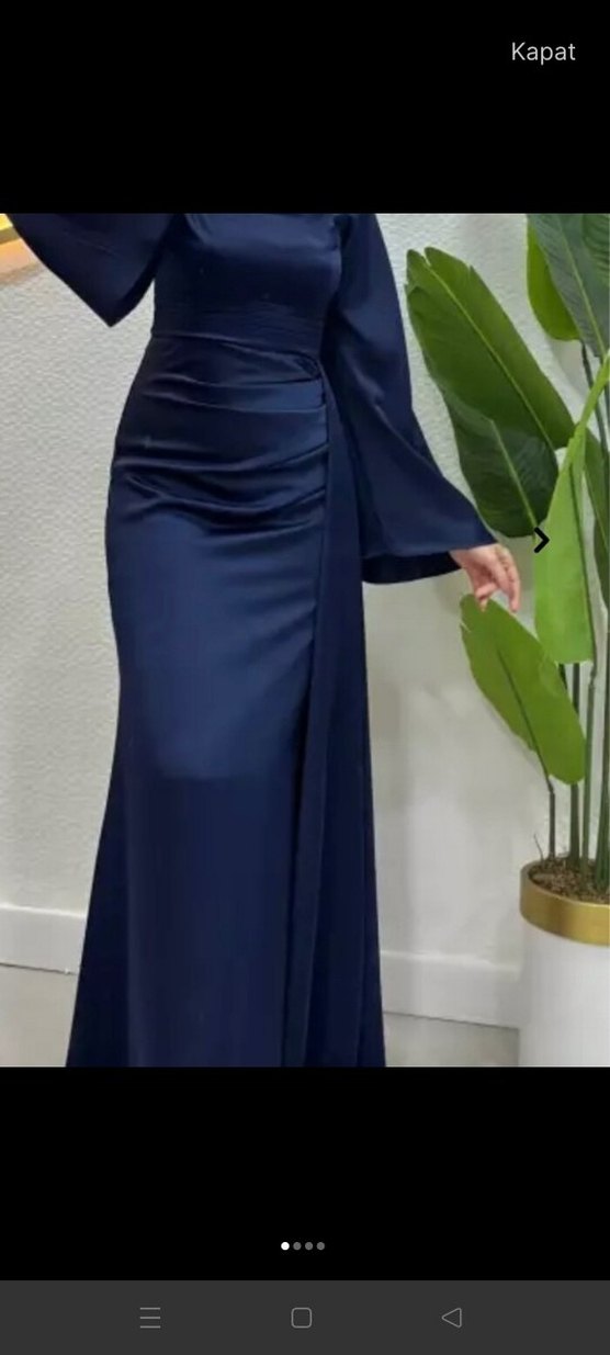 Mütevazı kesimli, lacivert uzun kollu abiye elbise, V yaka ve drapeli tasarımı ile düğünler için uygun, normal kesim. 38 beden 1 kere 2 saat giydim harika ve olduğundan zayıf gösterir. isteyen özel foto atarım alana şimdiden hayırlı olsun