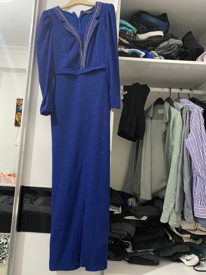 Uzun kollu, V yakalı ve drapeli tasarıma sahip lacivert abiye elbise, klasik şıklık için ideal, düzenli kesim ve hafif parlak dokunuş içerir. ✨