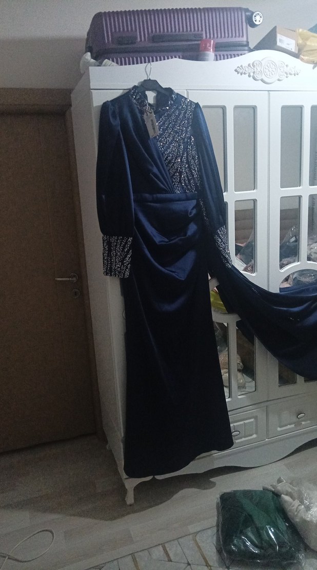 Uzun Kollu Drapeli Lacivert Kadın Abiye Elbise