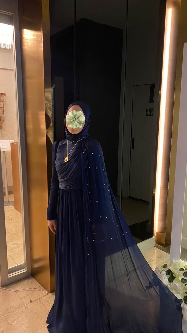 Lacivert, uzun kollu ve yüksek yakalı bu drapeli abiye elbise, modest ve gotik tarzda, düğünler için uygundur. Kumaşı akıcı ve üzeri hafif süslemelidir.