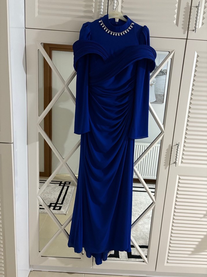 abiye drapeli tasarıma sahiptir. Modern klasik stil ve düzenli kesimle düğün ve özel davetler için uygundur. Bir kere 4 saatliğine giyildi en ufak bir taş düşmesi vs yok kuru temizlemesi yapıldı yeniden farksız 6500 tl alındı