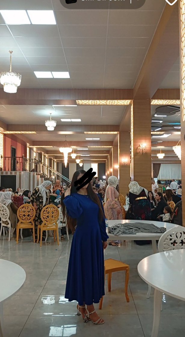 Uzun kollu, yüksek yakalı ve drapeli detaylara sahip, saten görünümlü mavi renkli, sade ve modest uzun elbise. Düğün için uygun.