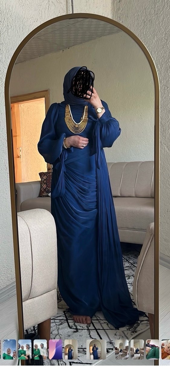 Uzun Kollu Drapeli Mavi Abiye Elbise