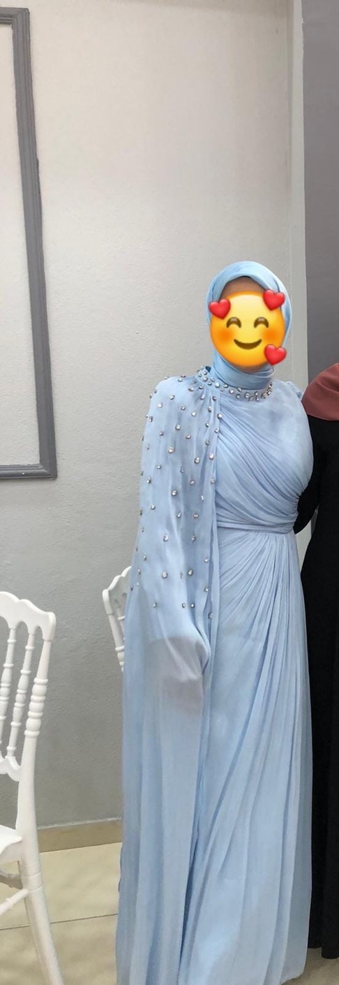 Bu uzun, dar kesim abiye elbise yüksek yakalı ve uzun kolludur. Drapeli ve nakışlı detaylara sahiptir. Pastel mavi rengiyle düğünler için mütevazı ve şık bir seçenek sunar.