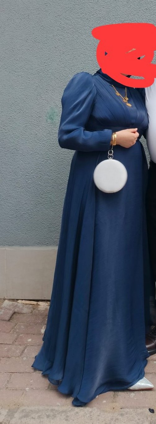 Uzun kollu, drapeli ve yakalı, salaş kesim mavi abiye elbisedir. Düğün için uygundur.