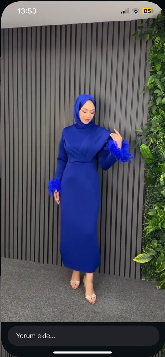 Drapeli detaylara ve uzun kollara sahip, yüksek yakalı, etnik desenli, canlı koyu mavi uzun elbise. Düğünler için şık ve modern bir tasarım.