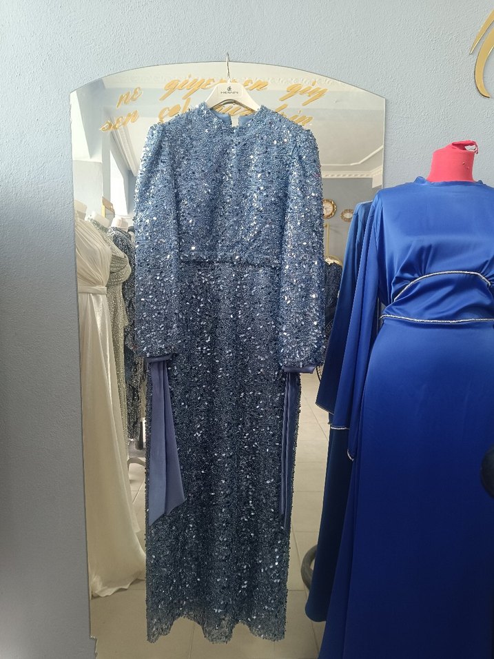 42-44-46 beden mevcut Uzun kollu, drapeli ve yuvarlak yakalı bu mavi-gri desenli abiye elbise, düzenli kesimiyle şık ve çağdaş bir tarz sunar. Düğünler için uygundur. ✨