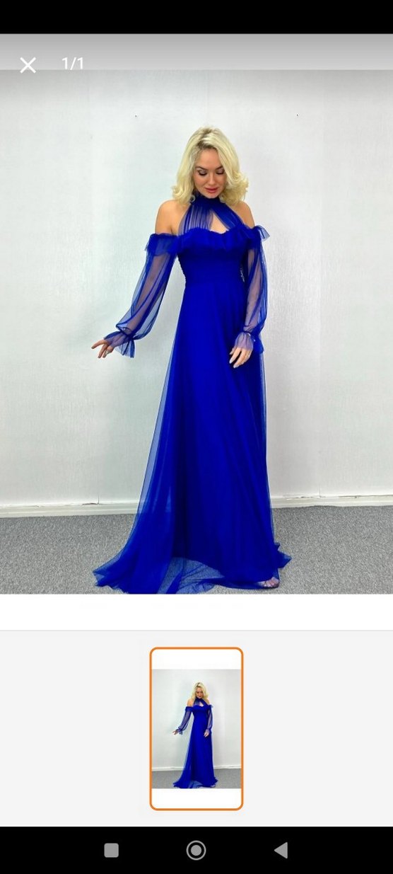 Bu uzun, fitted mavi abiye elbise, straplez yaka ve uzun, şeffaf drapeli kollara sahiptir. Desensiz ve gotik tarzda, düğünler için uygundur.