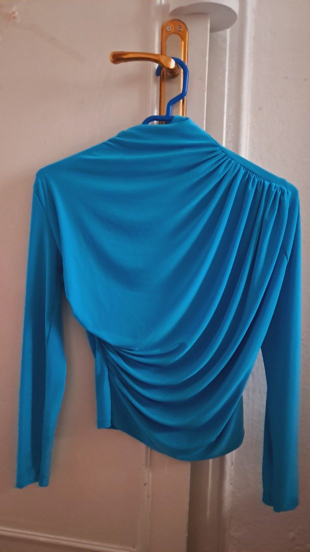 Parlak sentetik kumaştan, yüksek yakalı ve uzun kollu, drapeli, vücuda oturan mavi bluz, çağdaş ve avangart tarzda, günlük kullanıma uygun. Yanlış beden geldiği için hiç giymedim.