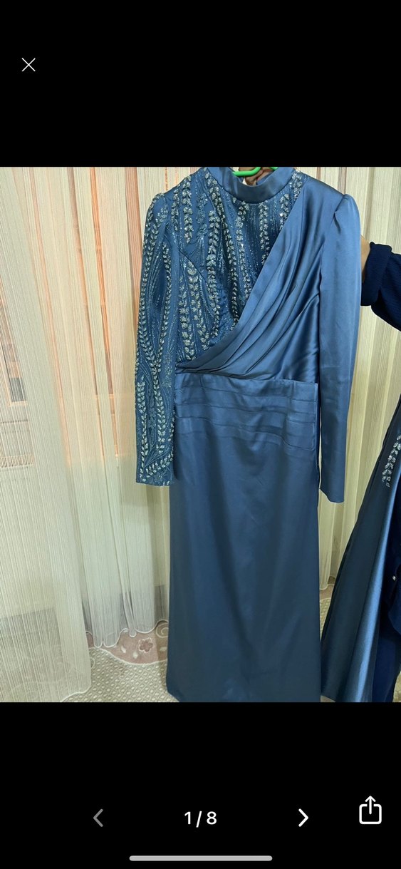 Uzun kollu, drapeli ve koyu mavi işlemeli detaylara sahip abiyenin kenarında genişletmek için ek yapılmış çıkarılıp eski haline getirilebilir