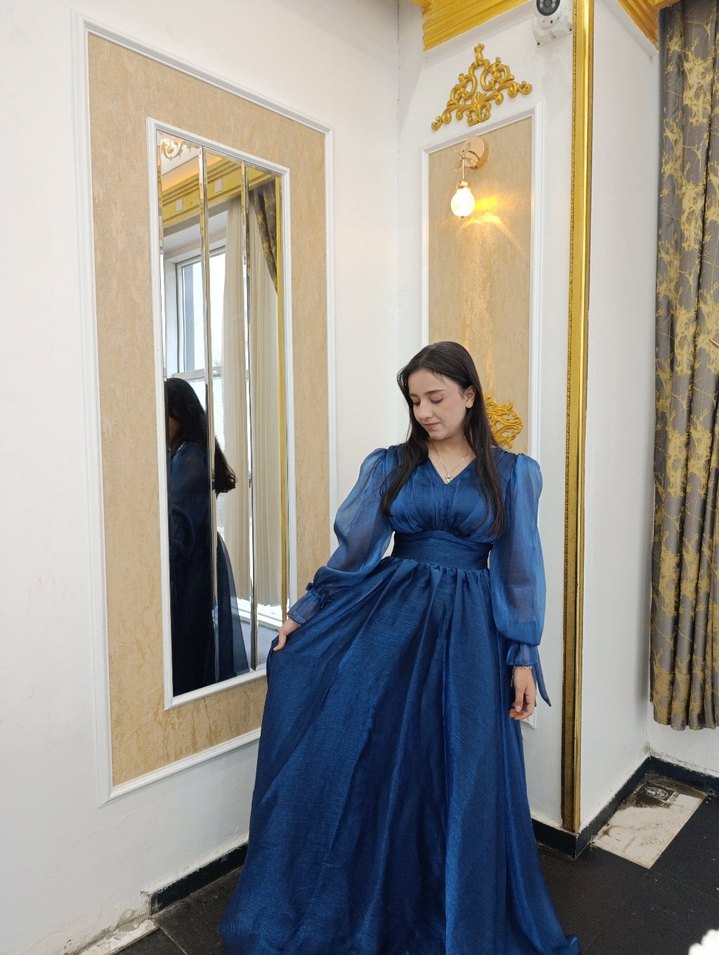 pazarlık payı vardır Uzun kollu, drapeli mavi abiye elbise. V yaka ve bol kesimli, parlak dokusuyla düğünler için uygundur. Bohem tarzda, klasik şıklık sunar.