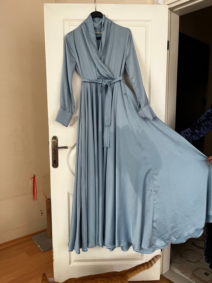 Yumuşak ve parlak kumaştan, bol kesim ve drapeli uzun kollu mavi elbise. Ofis için modern klasik tarzda uygun.üzerindeki leke su lekesidir yıkanınca geçer 38-40 benden 42 bedene kadar olur