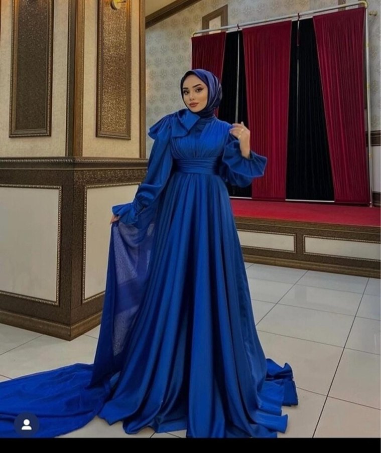 Uzun kollu, yüksek yakalı ve drapeli tasarıma sahip koyu mavi abiye. Düz kesim, düğün ve özel davetler için uygundur.