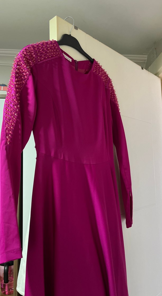 Bu uzun kollu, drapeli ve fitted kesimli mor abiye elbise, parlak kumaştan yapılmıştır. Romantik akşamlar için uygundur.