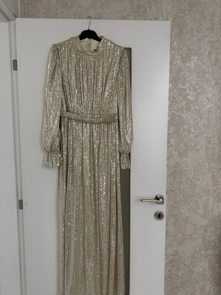Bu oturan kesim altın abiye elbise, yüksek yakalı ve uzun kolludur. Drapeli tasarımı ve parlak kumaşıyla düğünler için uygundur. ✨