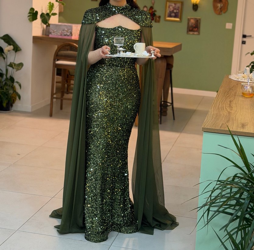 Uzun kollu, straplez yakalı ve drapeli pelerin detaylı, parlak ve baskılı haki renkli, klasik şıklıkta, düğünlere uygun abiye elbise. ✨Nişanımda tercih ettim