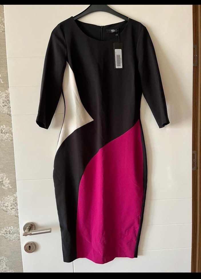 Uzun kollu, drapeli kalem elbise, pembe, siyah ve beyaz renklerde baskılı sentetik kumaştan, ofis için uygundur etiketi yok.