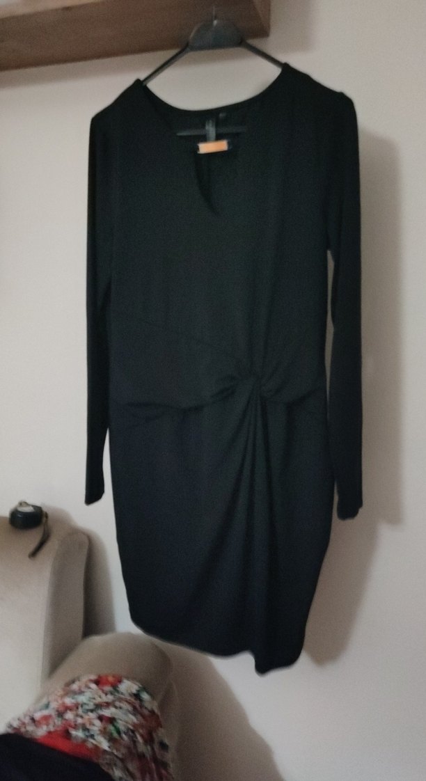 V yaka, uzun kollu ve beli drapeli, siyah renkte, yumuşak sentetik kumaştan yapılmış, ofise uygun, goth tarzı gece elbise. iki kol arasi 45 esnektir.uzunluk 90