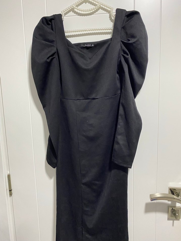 Uzun siyah gece elbisesi, drapeli tasarım ve tekne yaka ile fit kesime sahiptir. Uzun kollu ve gotik tarzda, ofis ve şık etkinlikler için uygundur.