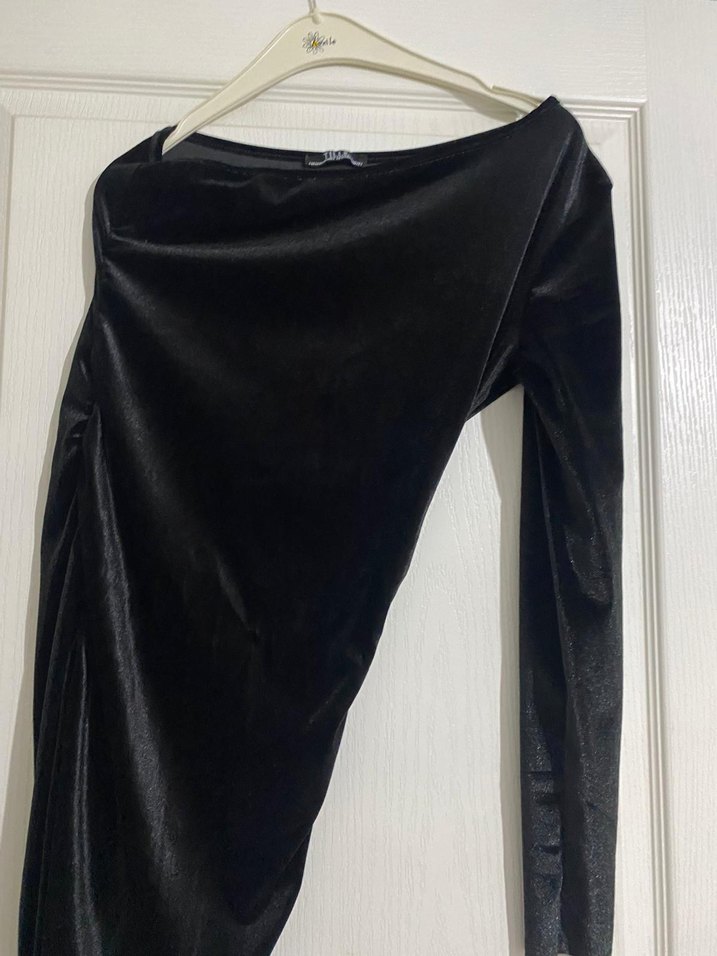 Bu siyah, uzun kollu ve drapeli elbise, tekne yaka ve vücuda oturan kesimiyle gotik tarzda ofis için uygun bir seçimdir. Esnek kumaştır.