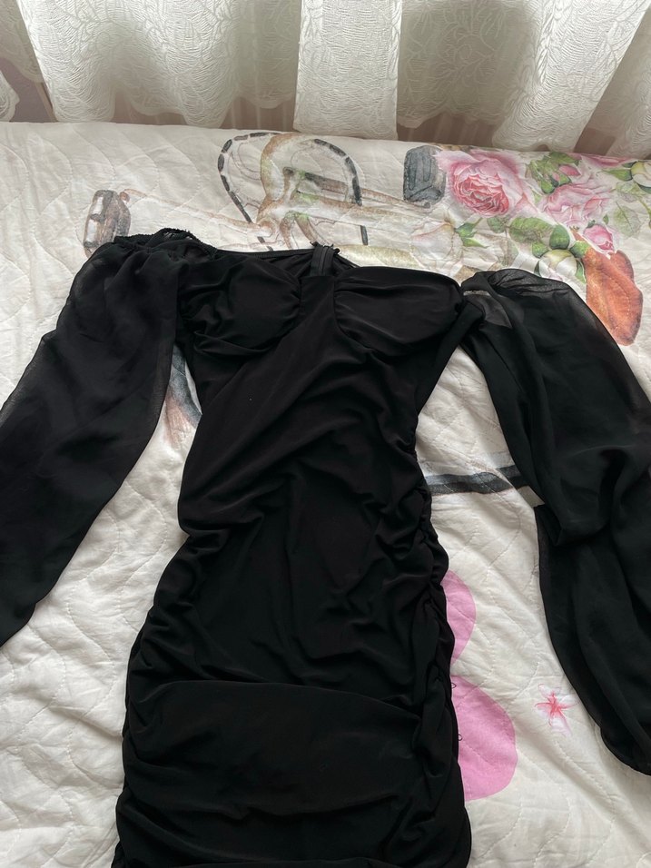 Dar kesim siyah gece elbisesi, uzun kollu ve drapeli tasarıma sahiptir. Straplez yakası gotik tarzı yansıtır, parti için uygundur.