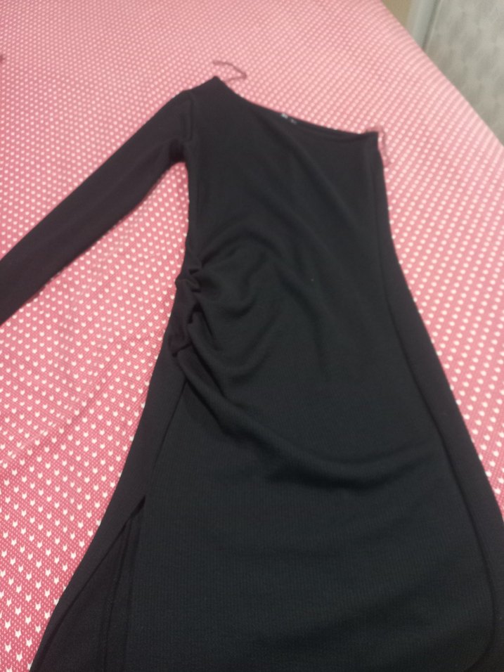 Uzun kollu, V yakalı ve drapeli detaylı siyah yandan yırtmaçlı tek omuz detayli minimal ve şık bir görünüm sunar, romantik akşamlar için uygundur.