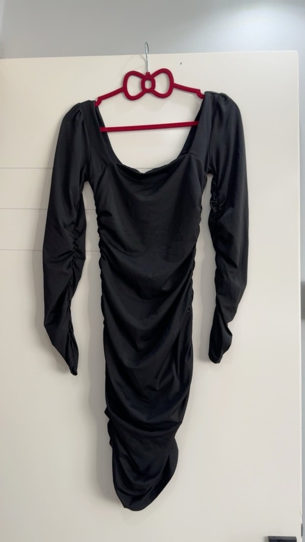 Drapeli ve uzun kollu, tek renk siyahelbise. Vücuda oturan kesimi ve tekne yakası ile cesur bir görünüm sunar.